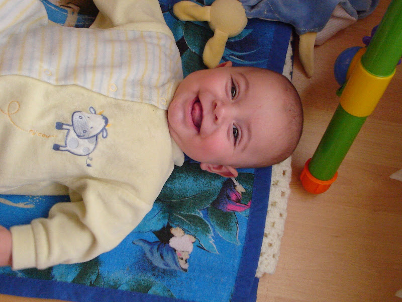 O restante da semana também não foi monótono. Na quarta o Daniel foi ao pediatra para a segunda rodada de vacinas, recebendo de presente uma injeção em cada coxa! Mas ele enfrentou a coisa com bravura, sequer prestando atenção à primeira injeção e chorando só um pouco depois da segunda. Felizmente ele também não teve nenhum efeito colateral, especialmente porque tivemos que deixá-lo sozinho com a babá por várias horas à noite, enquanto participávamos de um "speed dating científico" organizado pela universidade, tentando encontrar algum projeto/grupo de pesquisa interessante. O evento acabou não sendo muito produtivo para nós (embora em si tenha parecido um experimento interessante) mas pelo menos o Daniel e a Christin tiveram uma noite tranquila. Nessa semana o Daniel também se exercitou bastante: além da usual aula de natação (dessa vez sem a Kathrin, que teve que ficar no trabalho, e, portanto, sem uma só foto!), ele ficou treinando os braços com o baby gym (ou melhor, um braço - aparentemente ele está planejando ser destro ;-) ), fazendo flexões, praticando sentar, "lendo" revistas (ou seja, amassando e rasgando as revistas com toda a força) e brincando com a mamãe e o papai...