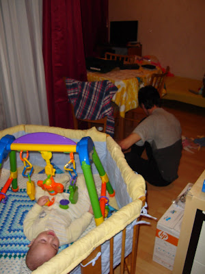 E, por último, finalmente montamos o cercadinho que meus sogros tinham trazido na semana anterior. Já era hora, já que o "cobertor de brincar" que mantínhamos para o Daniel no chão começara a se mostrar muito pequeno. E, como se pode ver, parece que ele gosta de seu novo playground...