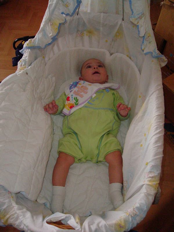 O Daniel no berço, com menos de uma semana; no berço agora; e agora em sua cama nova.