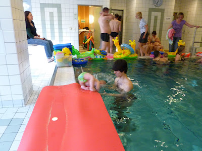 Como se isso já não fosse atividade o bastante, nesse mês também voltamos à natação para bebês. Com o Daniel gostando tanto dos seus banhos de banheira, tínhamos imaginado que ele poderia gostar disso. Bem, descobrimos ter subestimado o quanto ele gostaria: no primeiro dia do novo curso ele ficou pra lá de empolgado - chapinhando e chutando na água com tanto entusiasmo que tínhamos que manter uma certa distância dos outros pais e bebês. E, num dado momento, a instrutora chegou a desistir de demonstrar uma atividade nova para nós, comentando "deixa pra lá, vejo que esse cara já está ocupado...". ;-)