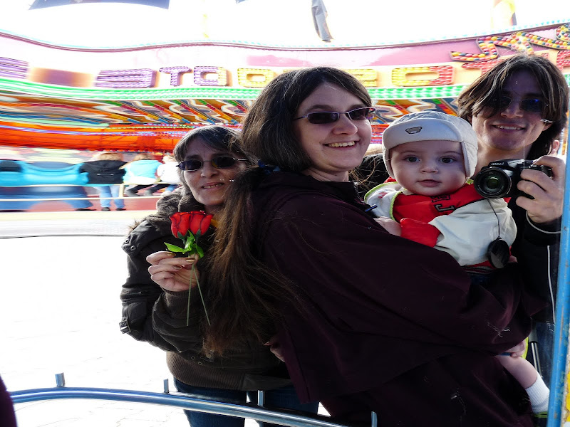 Depois dessas viagens mais excitantes, nos mantivemos mais perto de casa: um parque de diversões na cidade, uma refeição de grama e flores no gramado em frente ao ap e, para variar, indo fazer um horrível ;-) passeio de bicicleta: primeiro gastamos horas montando o carrinho para o Daniel, para então nos perdermos nas trilhas emaranhadas de um bosque, enquanto nossas terríveis e enormes bicicletas ficavam tentando derrubar minha mãe no chão. Enquanto isso, o Daniel mais uma vez, atordoado pelas novidades (ou só com sono mesmo), dormiu boa parte do tempo...